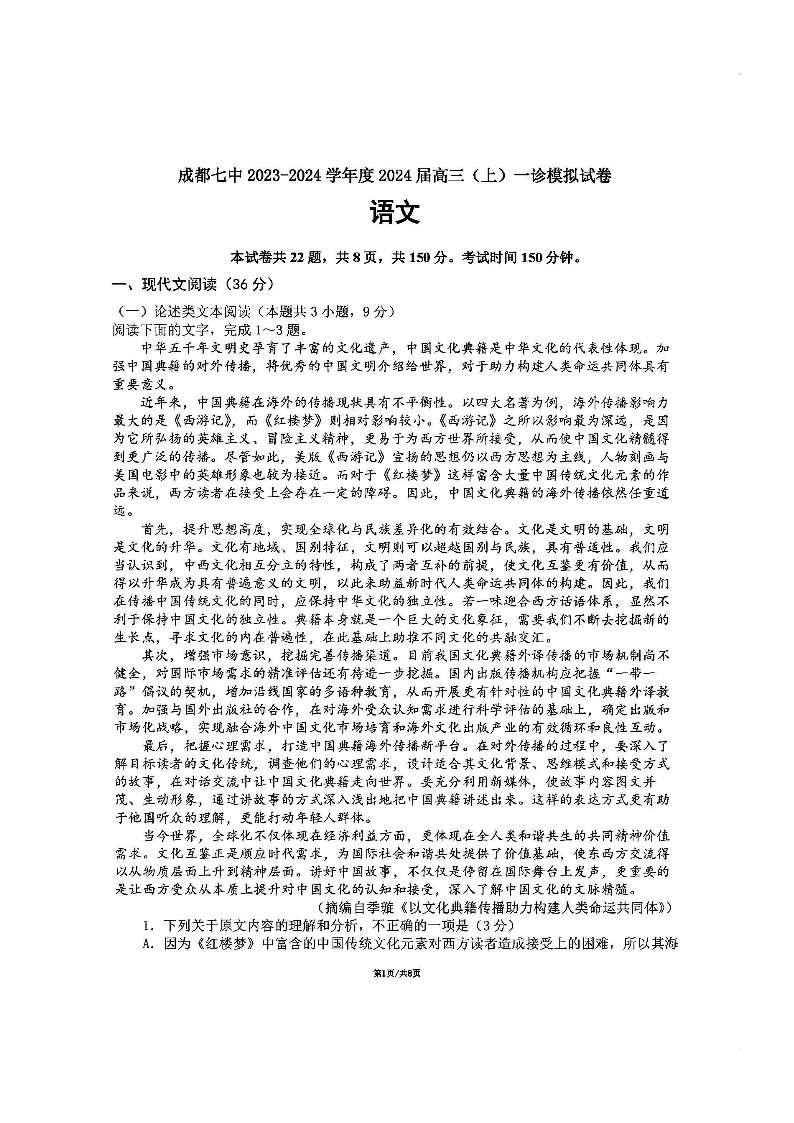 四川省成都市第七中学2024届高三上学期一诊模拟考试语文