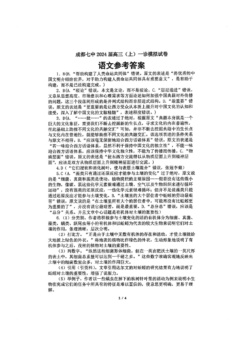 四川省成都市第七中学2024届高三上学期一诊模拟考试语文答案