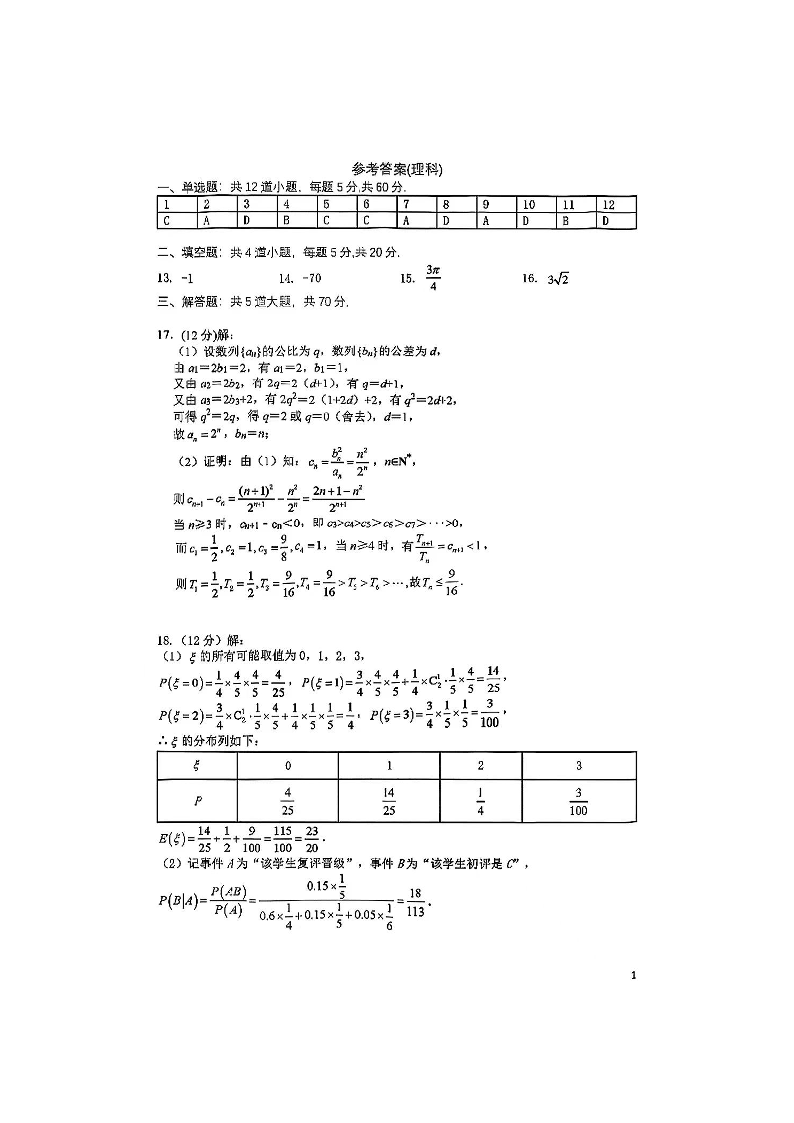 四川省成都市第七中学2024届高三上学期一诊模拟考试理科数学答案