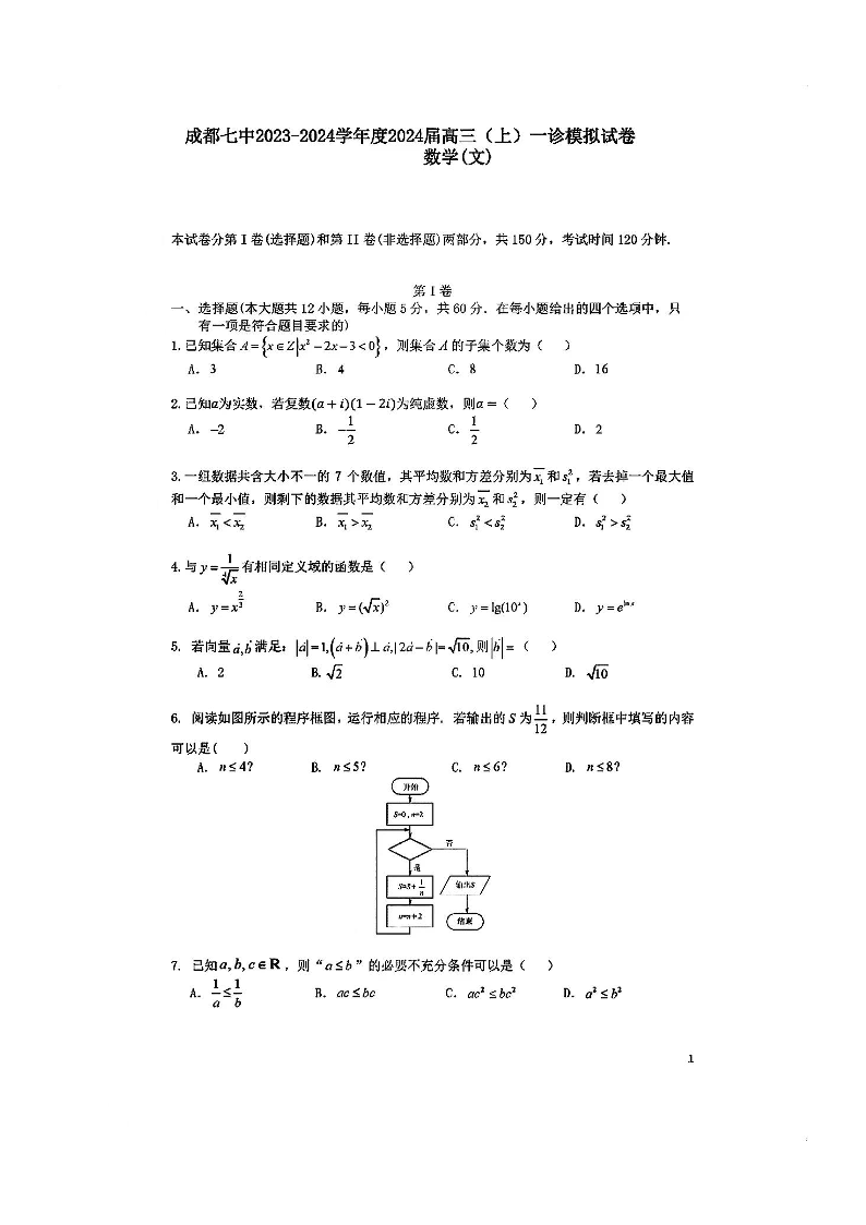 四川省成都市第七中学2024届高三上学期一诊模拟考试文科数学