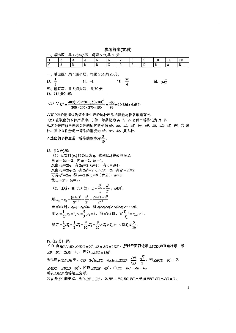 四川省成都市第七中学2024届高三上学期一诊模拟考试文科数学答案