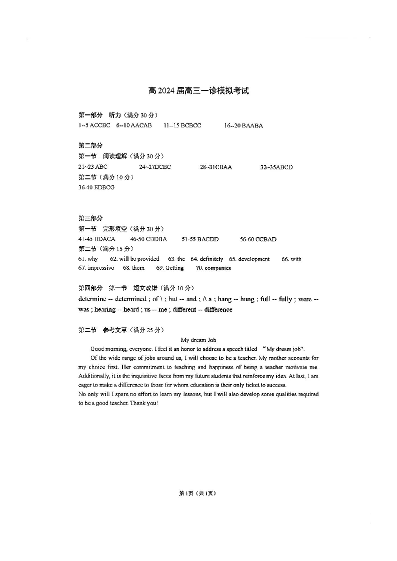 四川省成都市第七中学2024届高三上学期一诊模拟考试英语答案