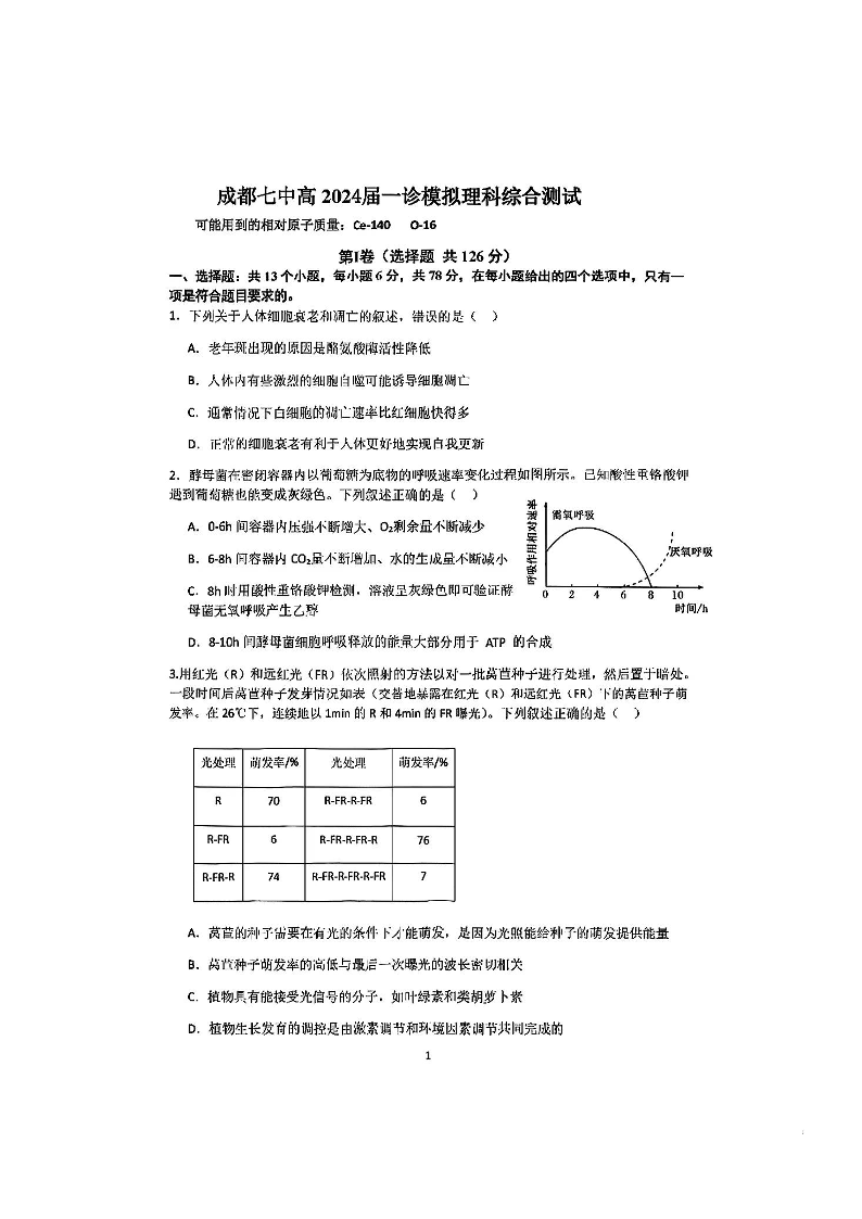 四川省成都市第七中学2024届高三上学期一诊模拟考试理综