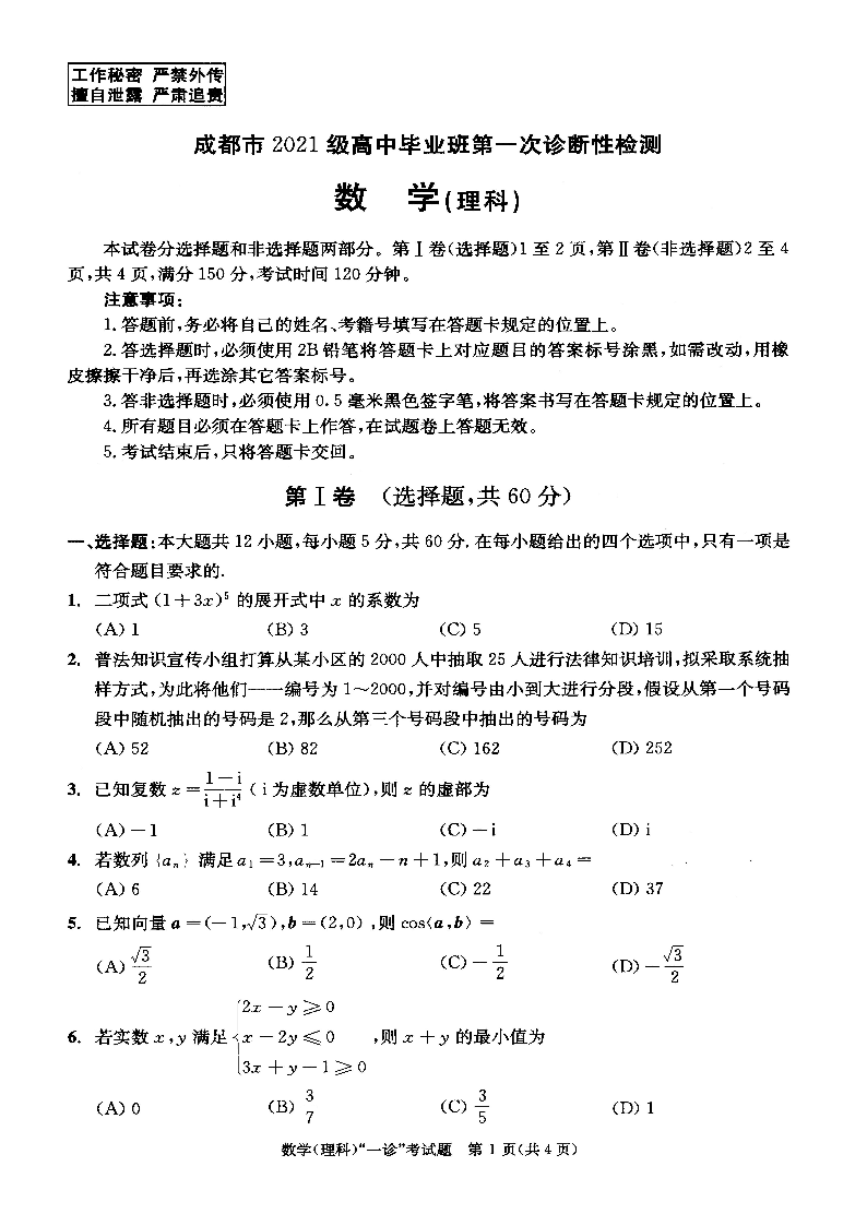 四川省成都市2021级高中毕业班第一次诊断性检测理科数学