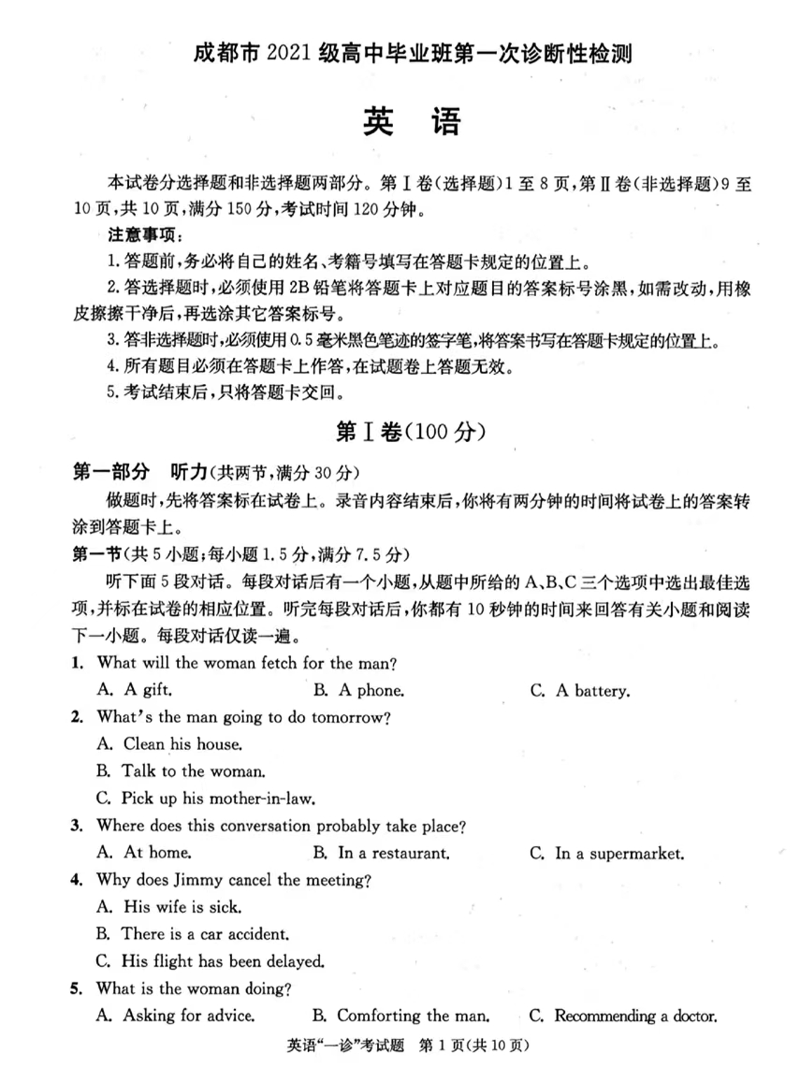 四川省成都市2021级高中毕业班第一次诊断性检测英语+答案