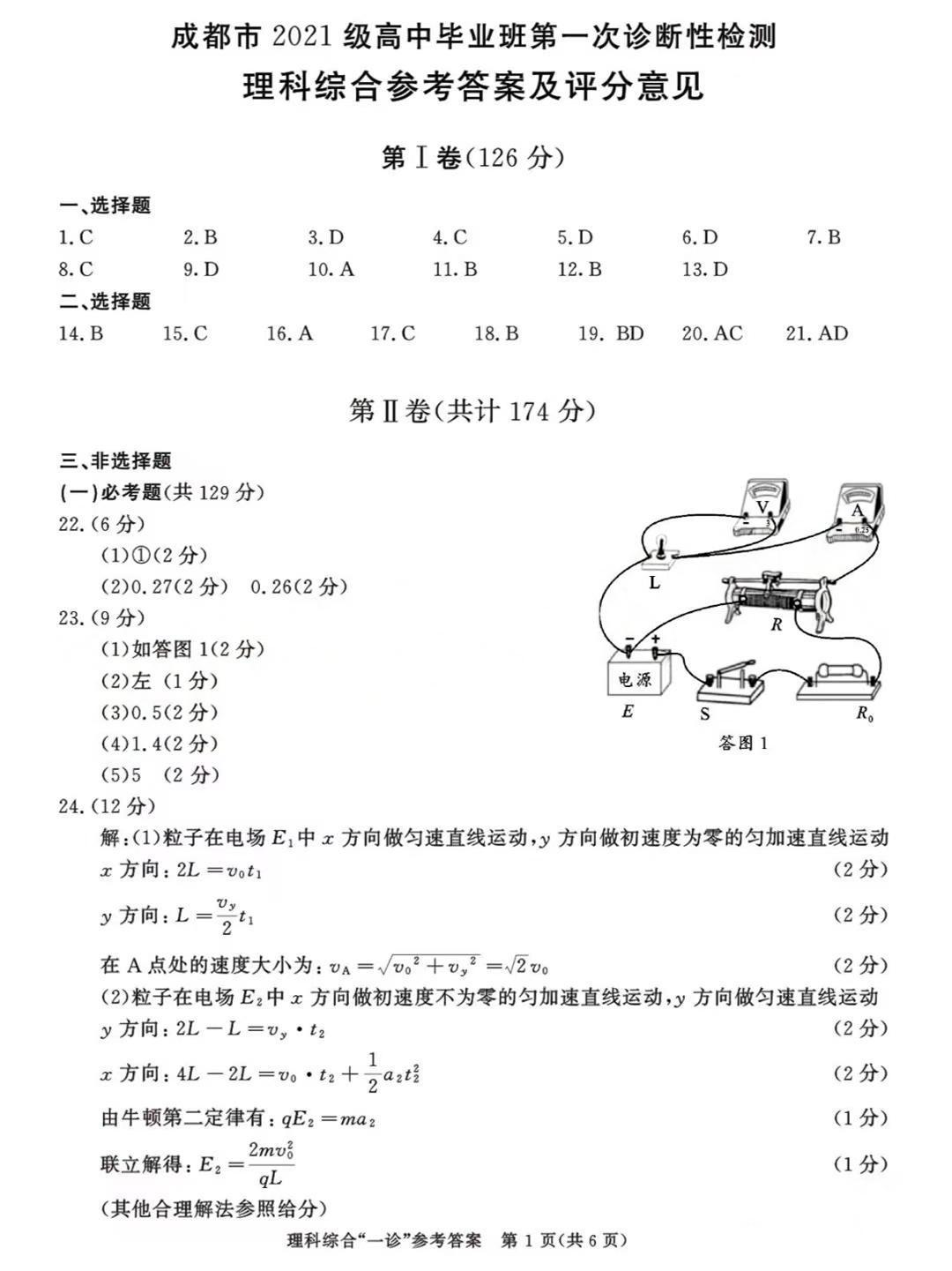 四川省成都市2021级高中毕业班第一次诊断性检测理综答案