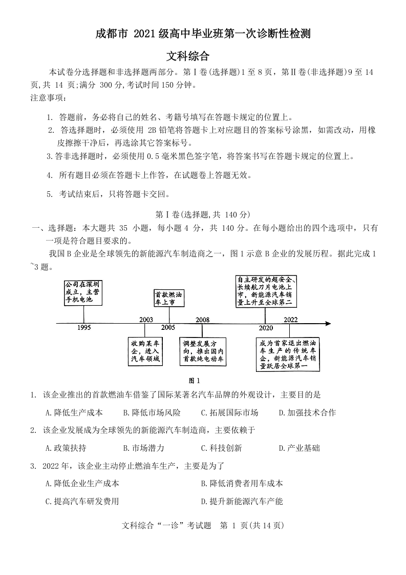四川省成都市2021级高中毕业班第一次诊断性检测文综