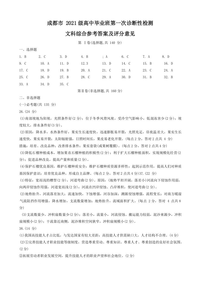 四川省成都市2021级高中毕业班第一次诊断性检测文综答案