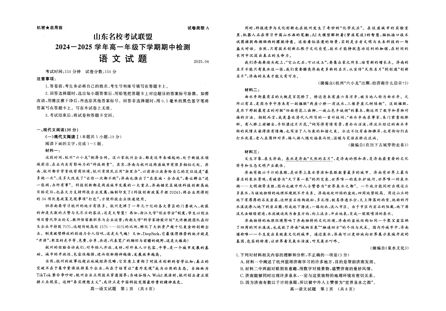 山东省名校考试联盟2024-2025学年学期4月高一期中检测语文