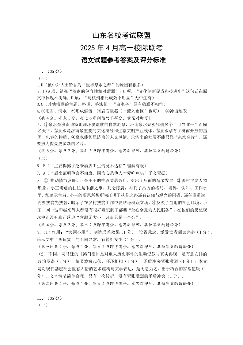 山东省名校考试联盟2024-2025学年学期4月高一期中检测语文答案