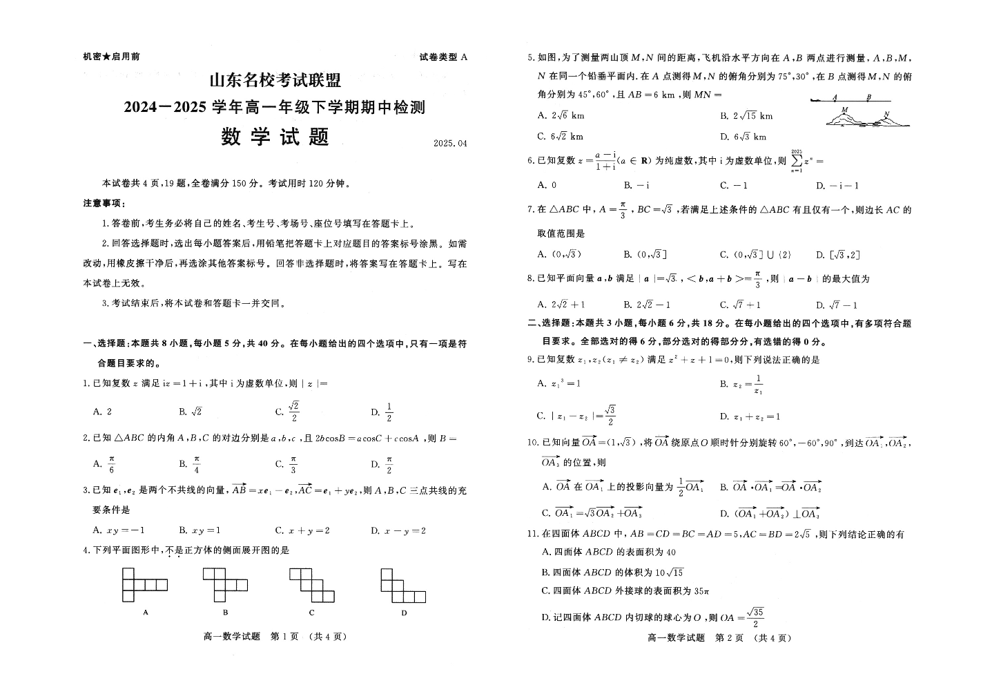 山东省名校考试联盟2024-2025学年学期4月高一期中检测数学