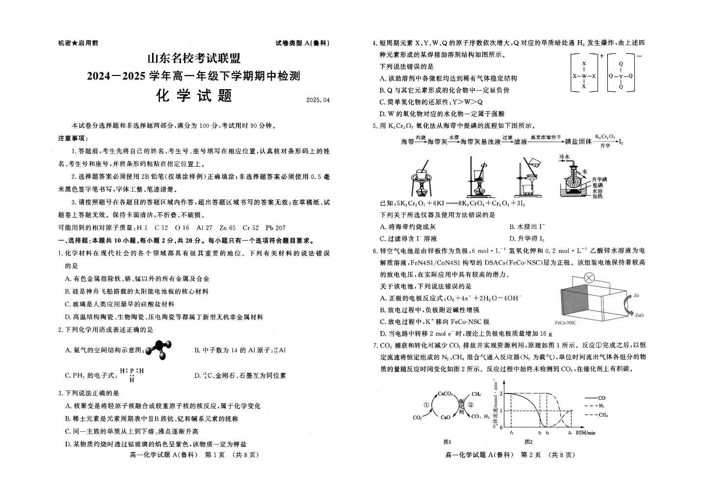 山东省名校考试联盟2024-2025学年学期4月高一期中检测化学