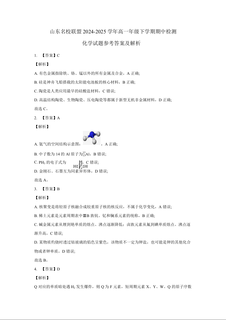 山东省名校考试联盟2024-2025学年学期4月高一期中检测化学(A)LK解析