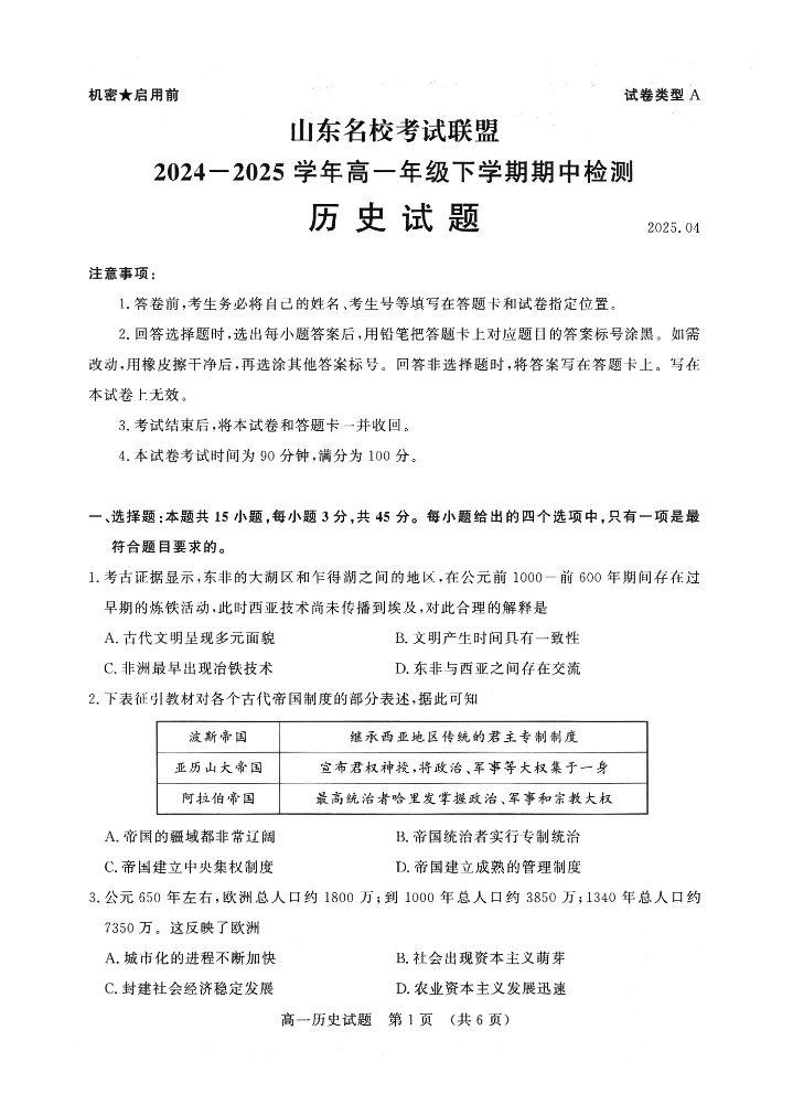 山东省名校考试联盟2024-2025学年学期4月高一期中检测历史