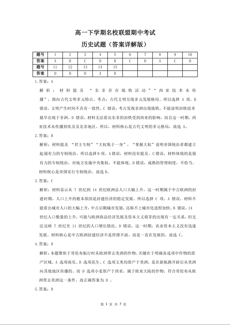 山东省名校考试联盟2024-2025学年学期4月高一期中检测历史答案详解