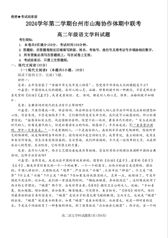 浙江省台州市山海协作体2024-2025学年下学期4月高二期中联考语文+答案