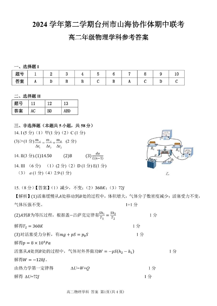 浙江省台州市山海协作体2024-2025学年下学期4月高二期中联考物理答案
