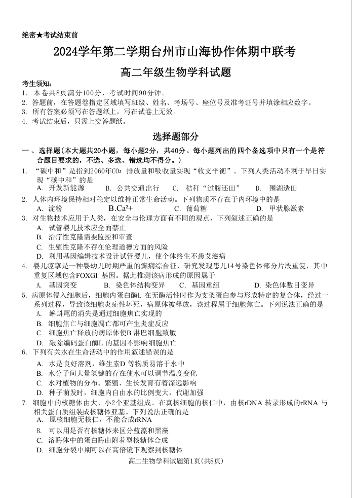 浙江省台州市山海协作体2024-2025学年下学期4月高二期中联考生物+答案