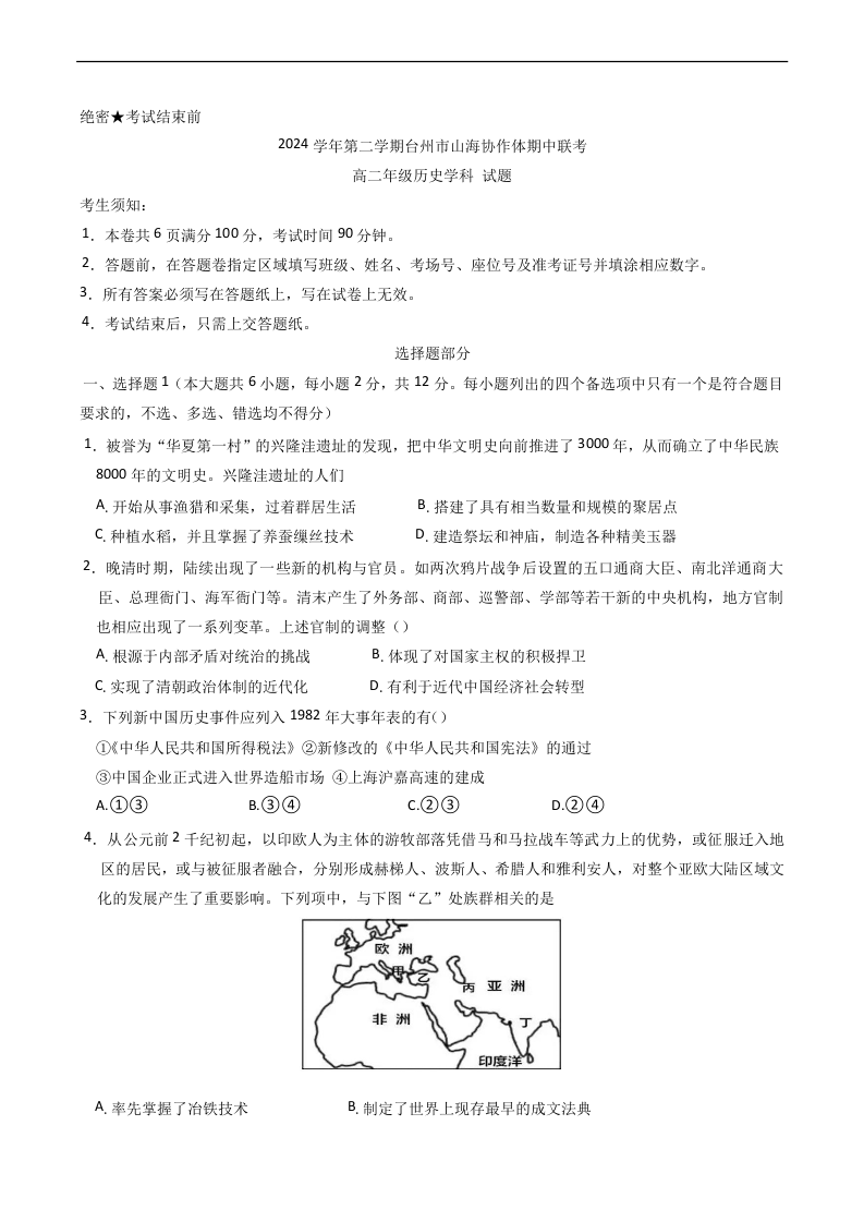 浙江省台州市山海协作体2024-2025学年下学期4月高二期中联考历史+答案
