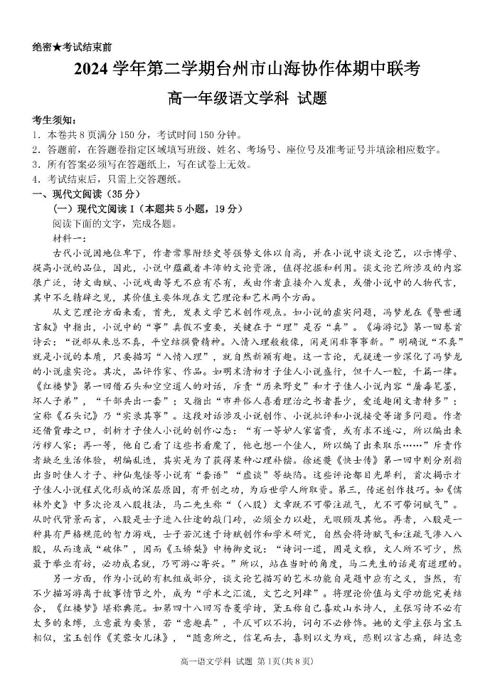 浙江省台州市山海协作体2024-2025学年下学期4月高一期中联考语文+答案