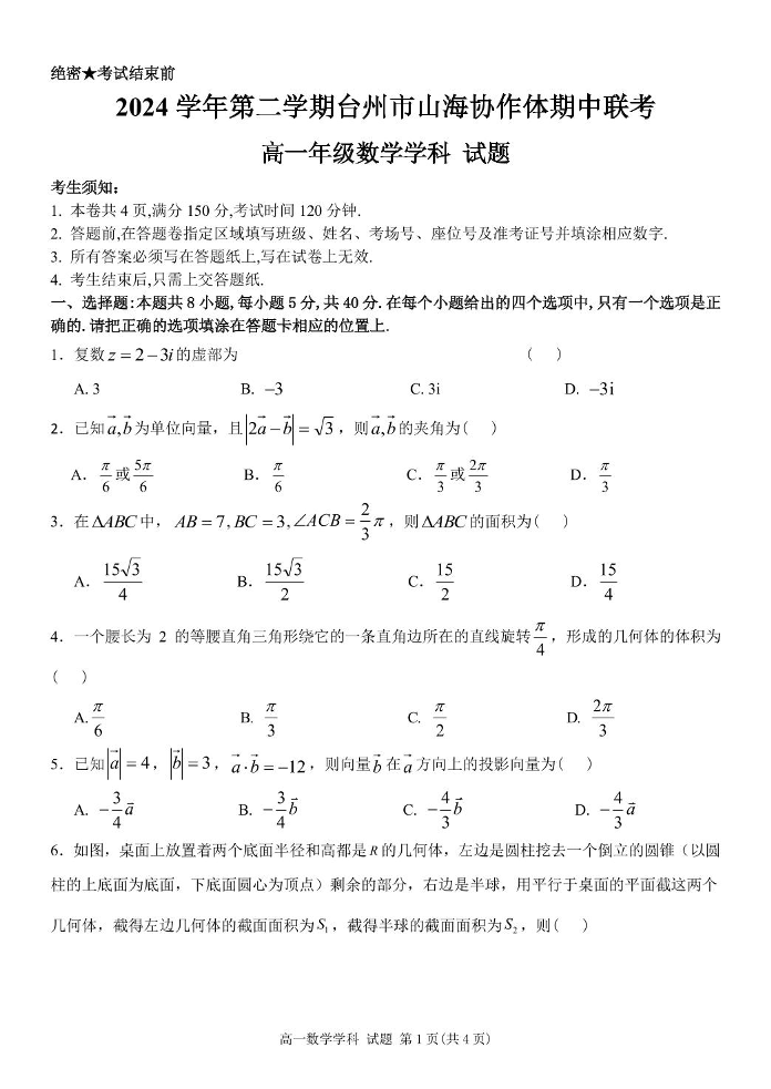 浙江省台州市山海协作体2024-2025学年下学期4月高一期中联考数学