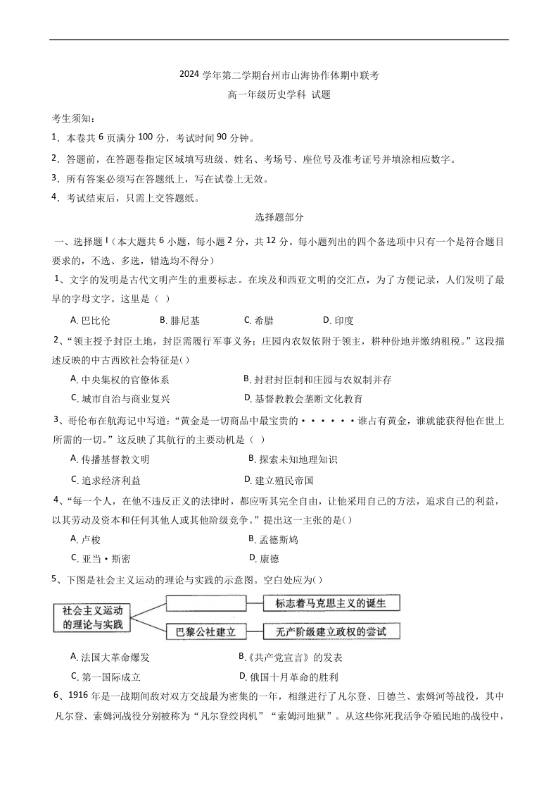 浙江省台州市山海协作体2024-2025学年下学期4月高一期中联考历史+答案