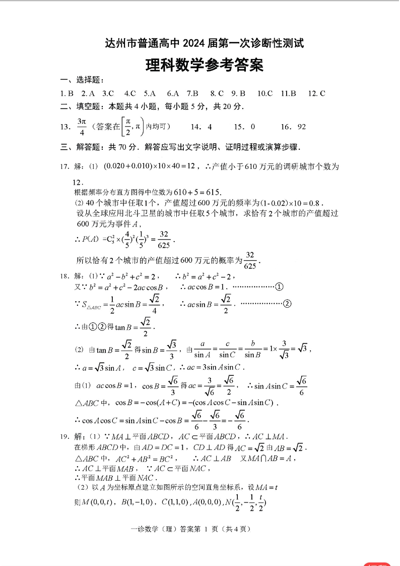 四川省达州市普通高中2024届高三上学期第一次诊断性考试理科数学答案