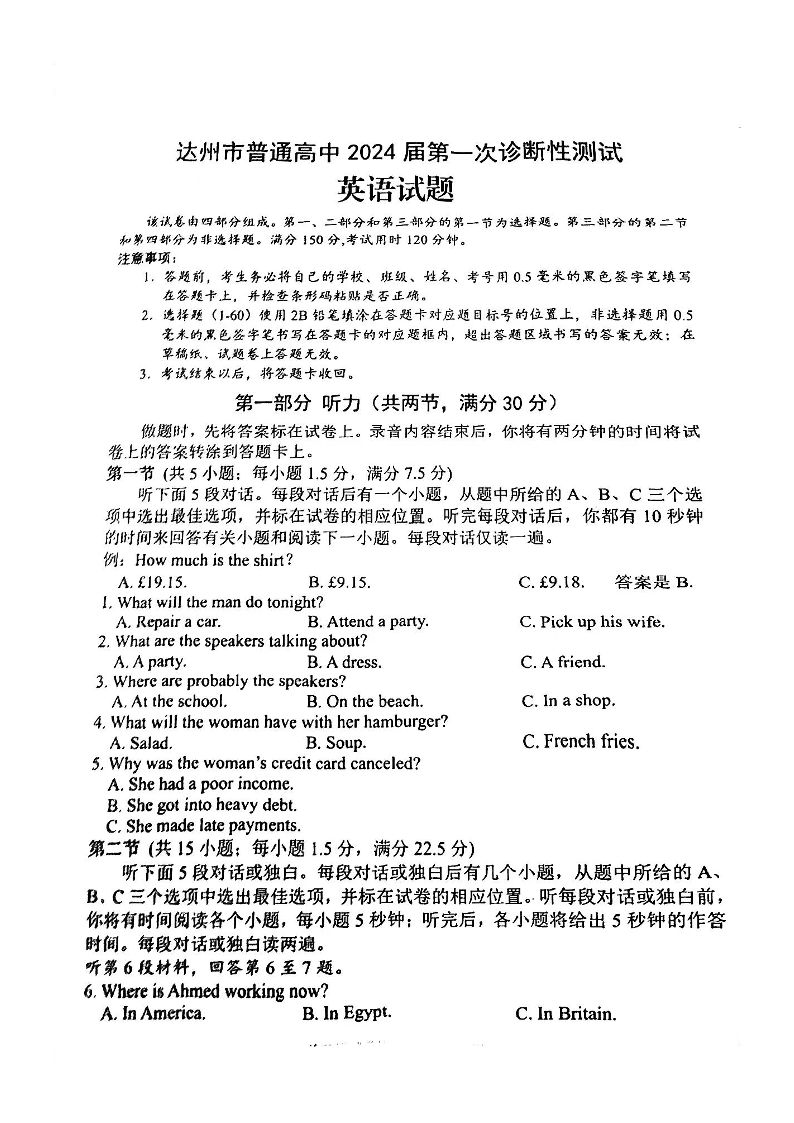 四川省达州市普通高中2024届高三上学期第一次诊断性考试英语