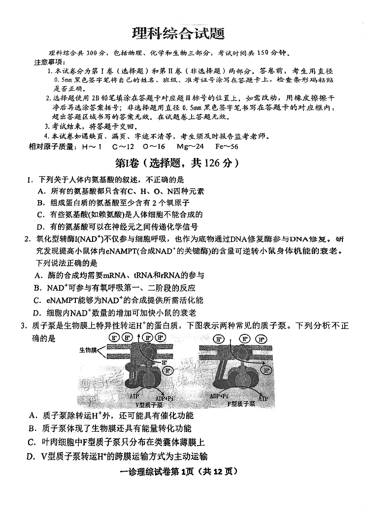 四川省达州市普通高中2024届高三上学期第一次诊断性考试理综