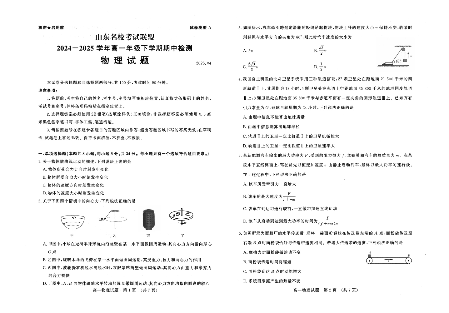 山东省名校考试联盟2024-2025学年学期4月高一期中检测物理