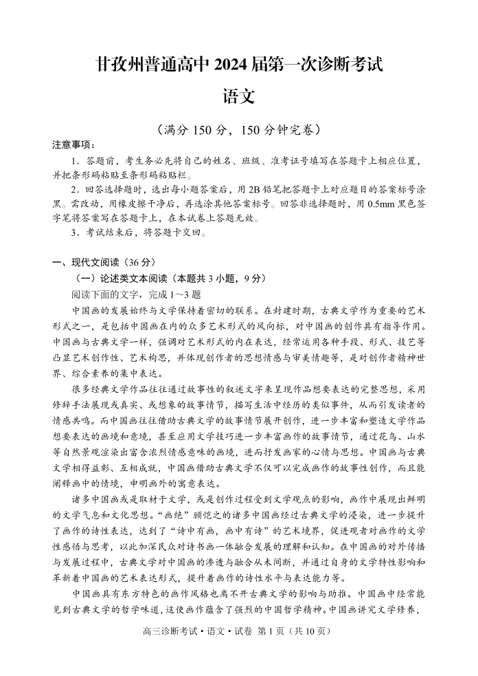 四川省甘孜州2024届高三上学期第一次诊断考试语文