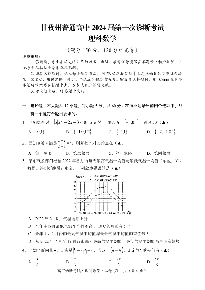 四川省甘孜州2024届高三上学期第一次诊断考试理科数学