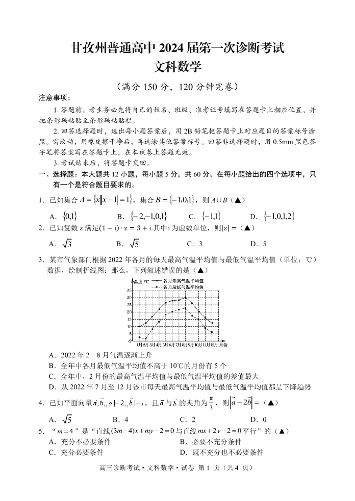 四川省甘孜州2024届高三上学期第一次诊断考试文科数学