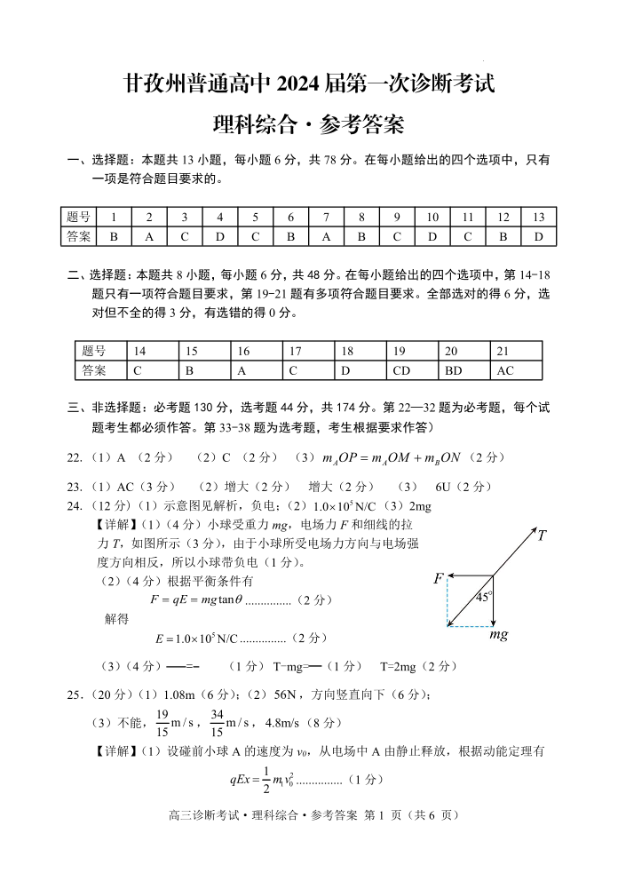 四川省甘孜州2024届高三上学期第一次诊断考试理综答案