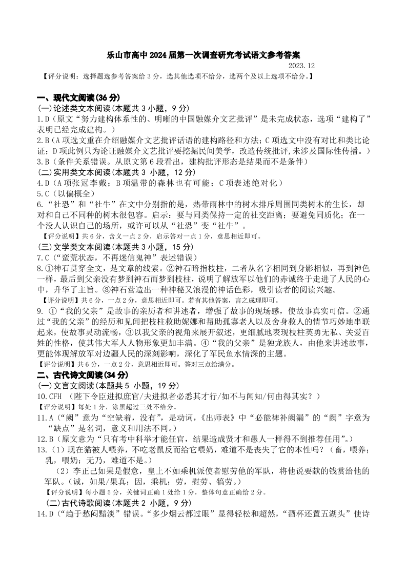 四川省乐山市2024届高三上学期第一次调研考试语文答案