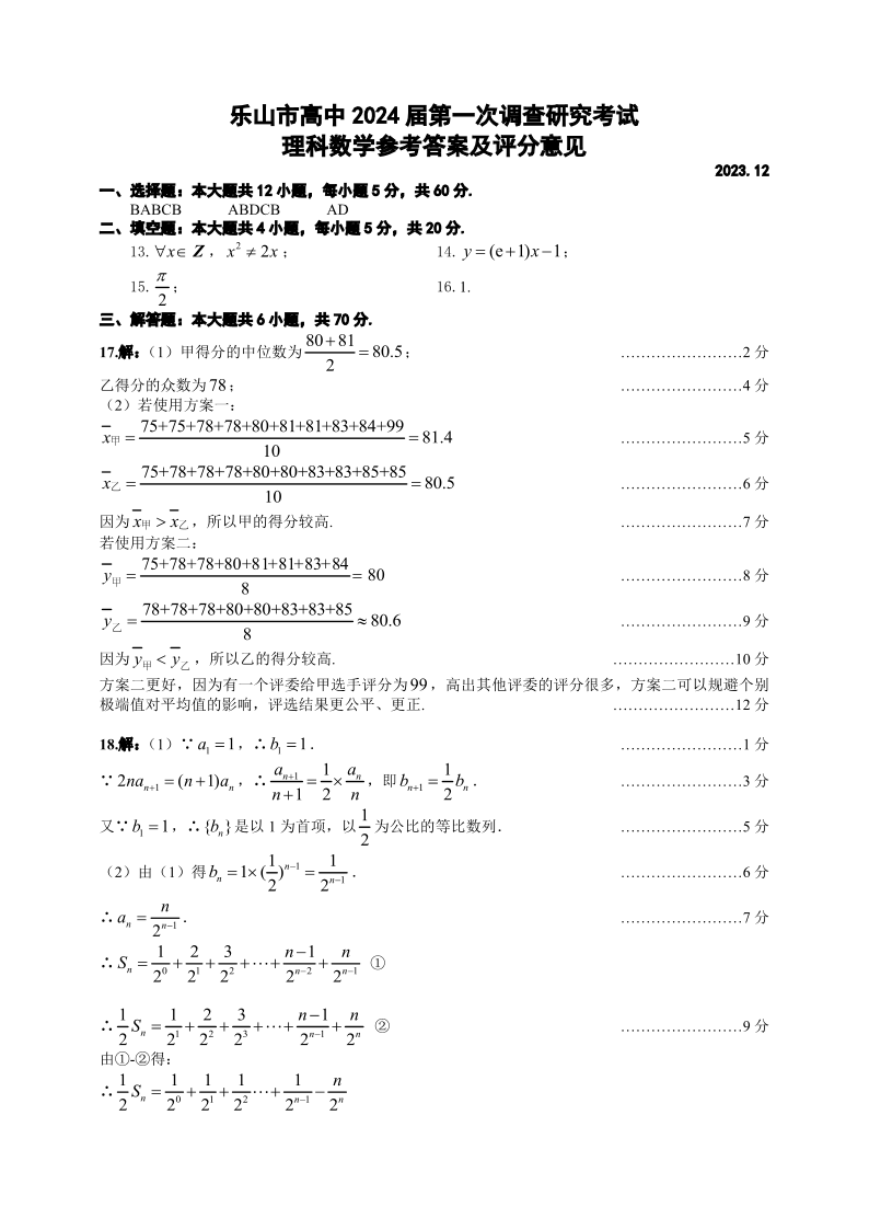 四川省乐山市2024届高三上学期第一次调研考试理科数学答案
