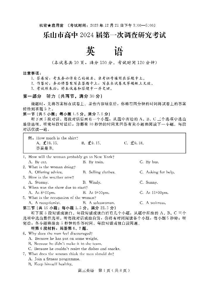 四川省乐山市2024届高三上学期第一次调研考试英语