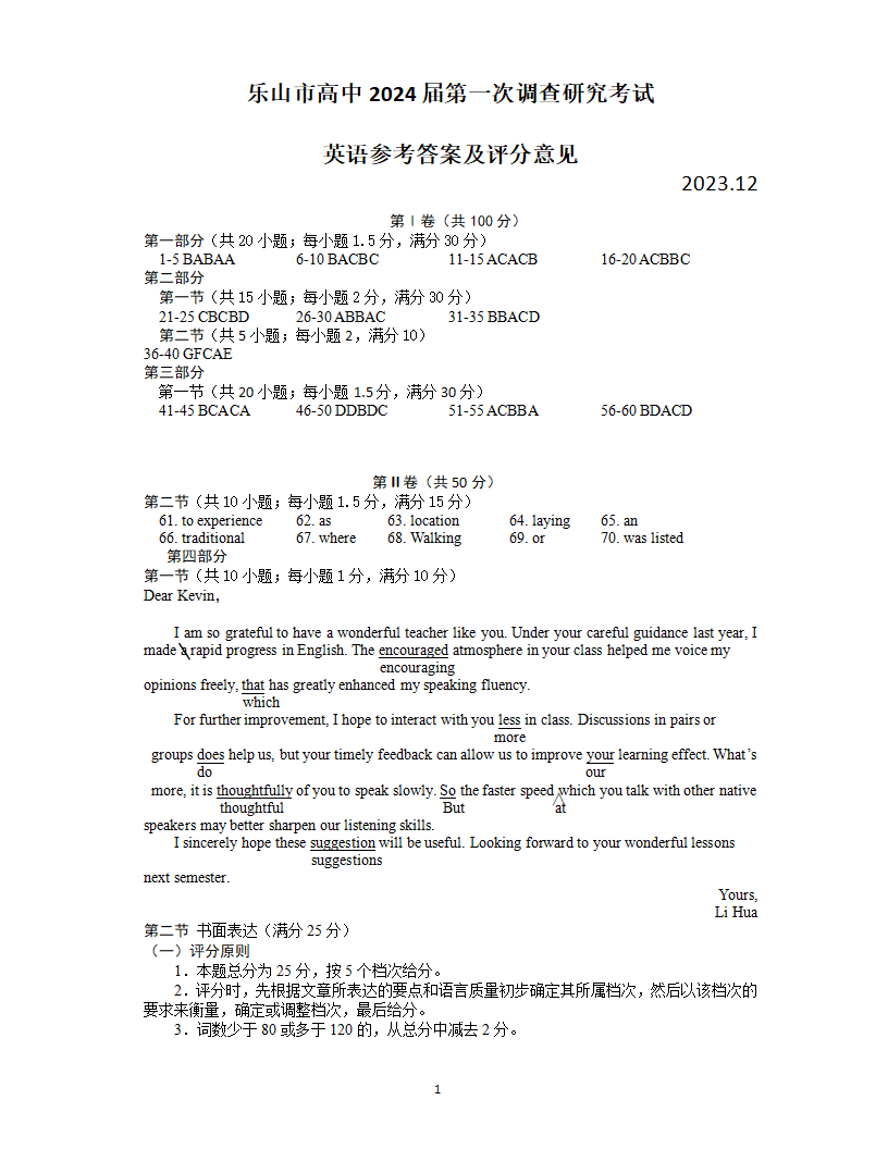 四川省乐山市2024届高三上学期第一次调研考试英语答案