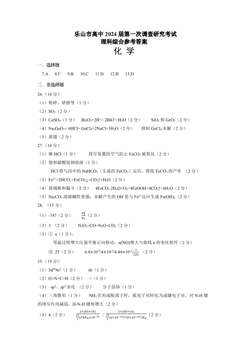 四川省乐山市2024届高三上学期第一次调研考试理综答案