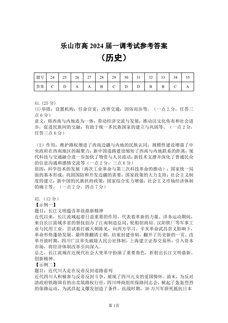 四川省乐山市2024届高三上学期第一次调研考试文综历史答案