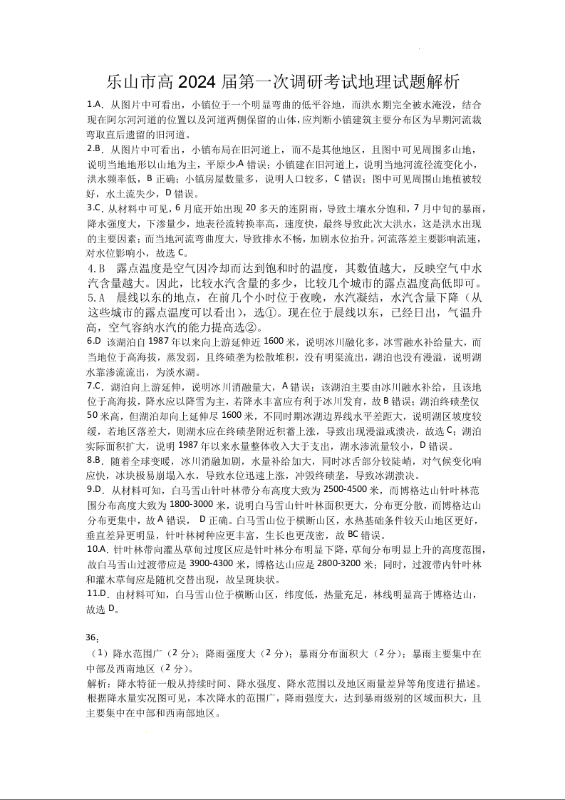 四川省乐山市2024届高三上学期第一次调研考试文综地理答案