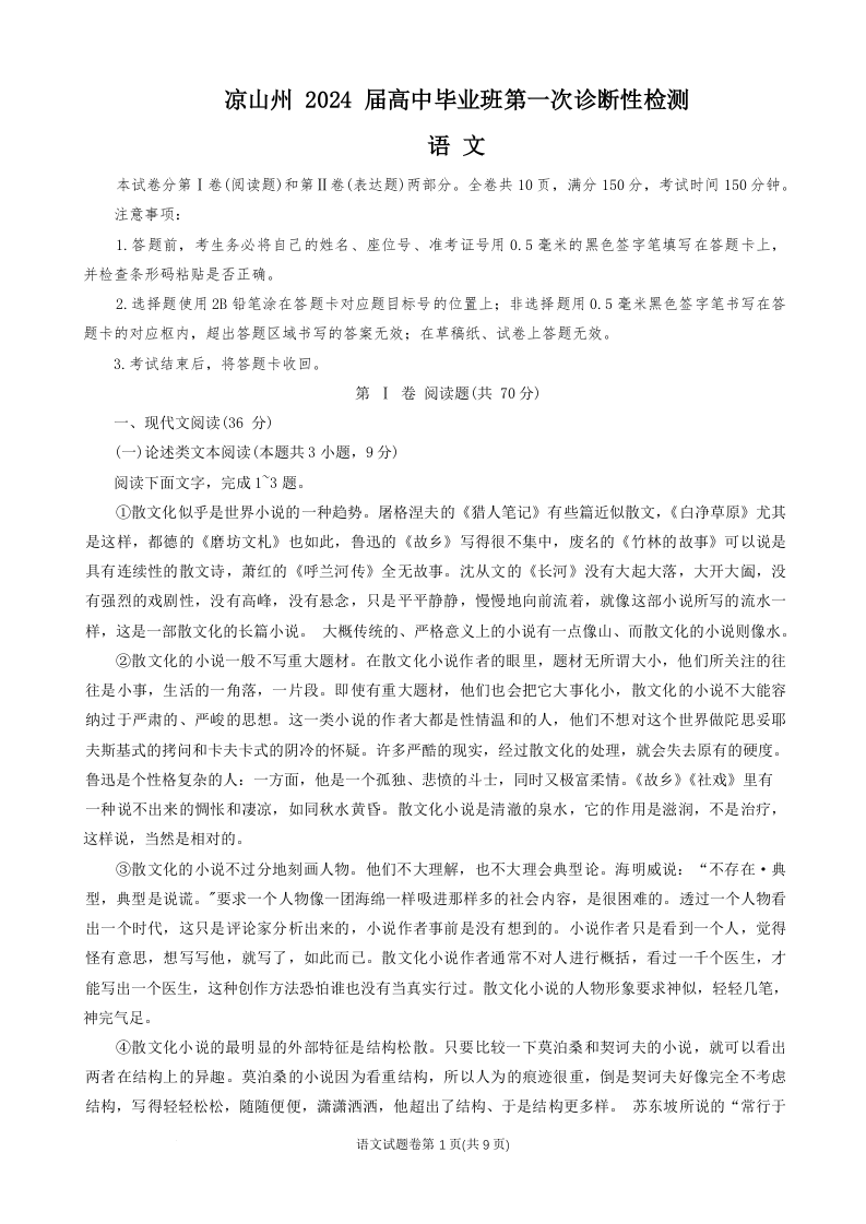 四川省凉山彝族自治州2024届高三第一次诊断性检语文
