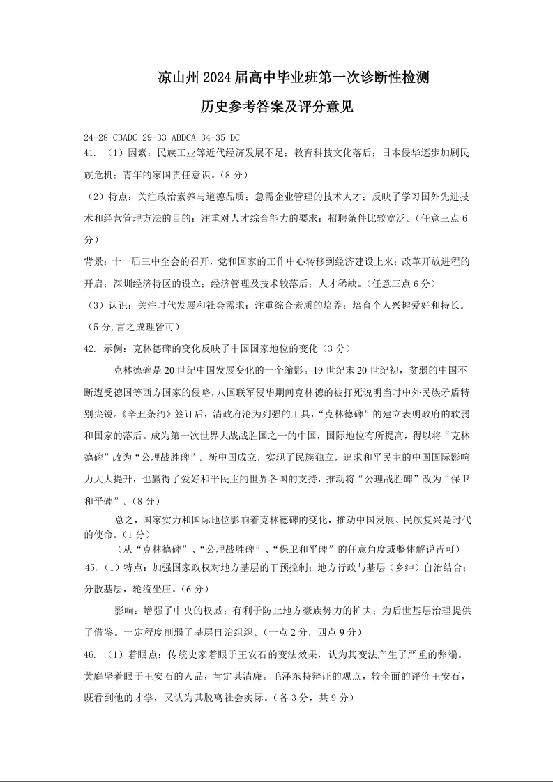 四川省凉山彝族自治州2024届高三第一次诊断性检历史答案