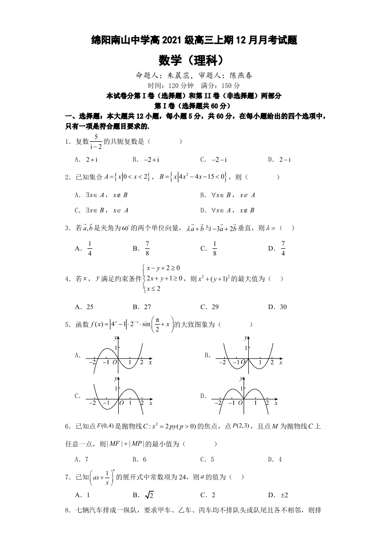 四川省绵阳南山中学2024届高三上学期12月月考理数