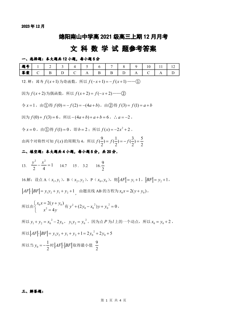 四川省绵阳南山中学2024届高三上学期12月月考文科数学答案