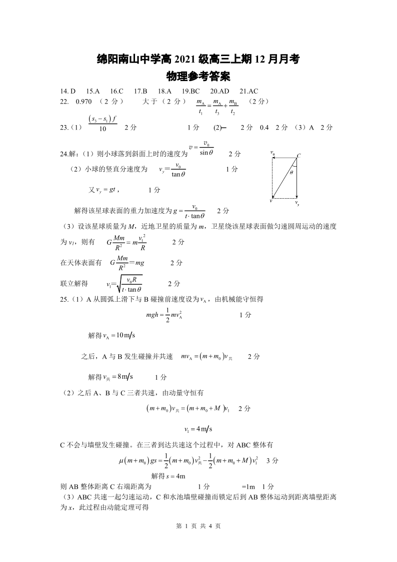 四川省绵阳南山中学2024届高三上学期12月月考理综答案