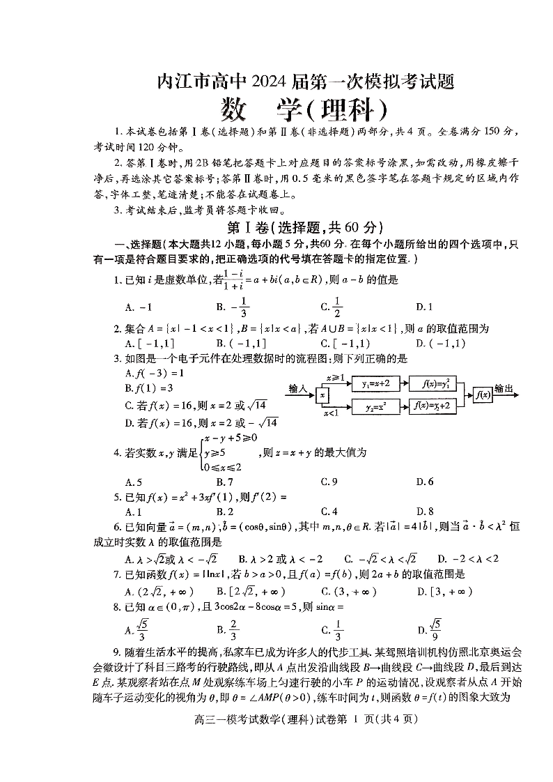 四川省内江市高中2024届高三上学期第一次模拟考试理科数学+答案