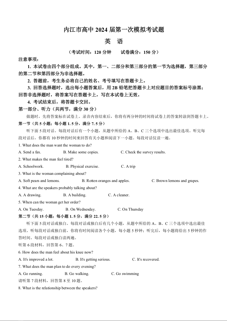 四川省内江市高中2024届高三上学期第一次模拟考试英语