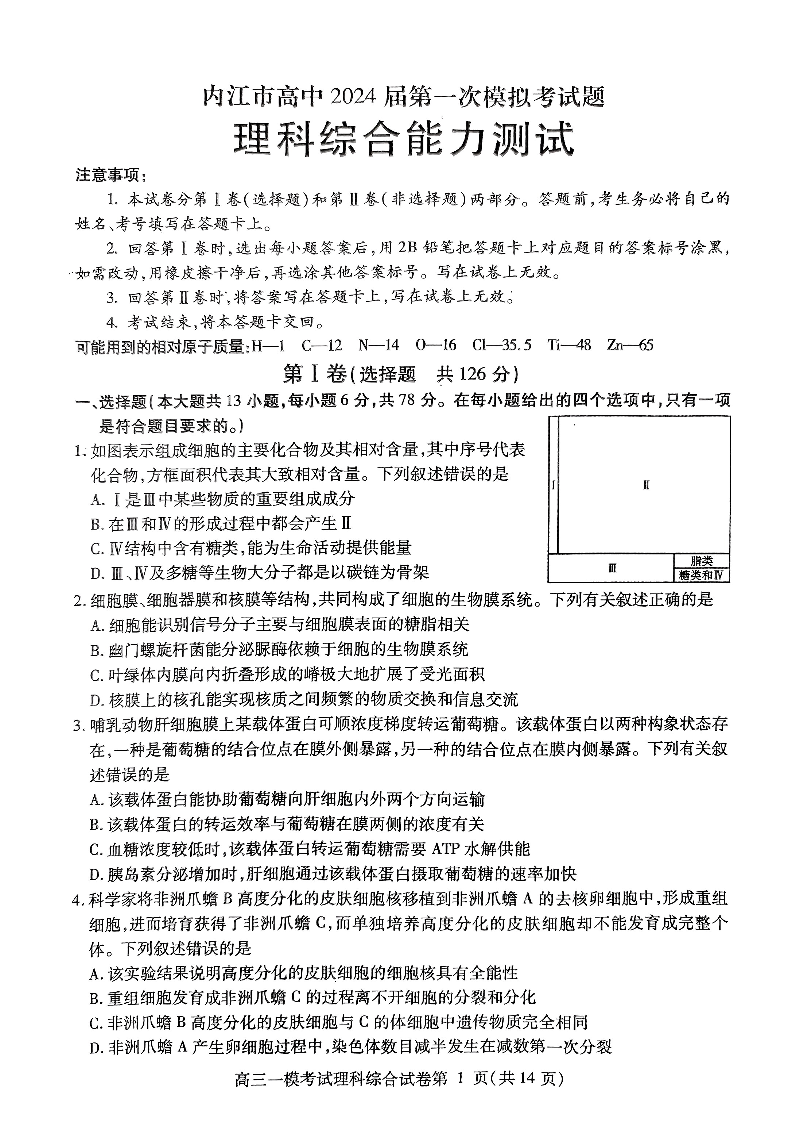 2024届四川省内江市高中高三上学期第一次模拟考试理综+答案