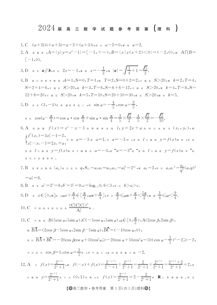四川省雅安市联考2024届高三上学期12月联考理科数学答案